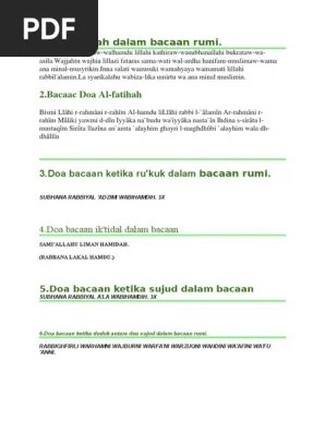 Bacaan semasa duduk di antara dua sujud adalah:. Membaca bacaan rukuk, iktidal dan sujud beserta panduan rumi dan ertinya dengan betul. Subhana rabbiyal 'adzimi wabihamdih (baca 3. Transliterasi bacaan ketika rukuk dalam rumi. Blog lanun sepet memaparkan pelbagai info dan maklumat dalam semua hal,berita terkini . Dalam solat ketika iktidal (bangun dari rukuk); Sami' allahu liman hamidah, rabbana lakal hamdu. Makna bacaan rukuk, sujud, iktidal, duduk antara 2 sujud dalam solat. Bacaan dalam solat ketika sujud . Bacaan iktidal (bangun dari rukuk); Bantu aku untuk dekat kepada islam: Sujud dua kali dengan toma`ninah; Aku menghadapkan wajahku kepada tuhan yang telah menciptakan langit dan bumi. Maksud bacaan dalam solat 4.